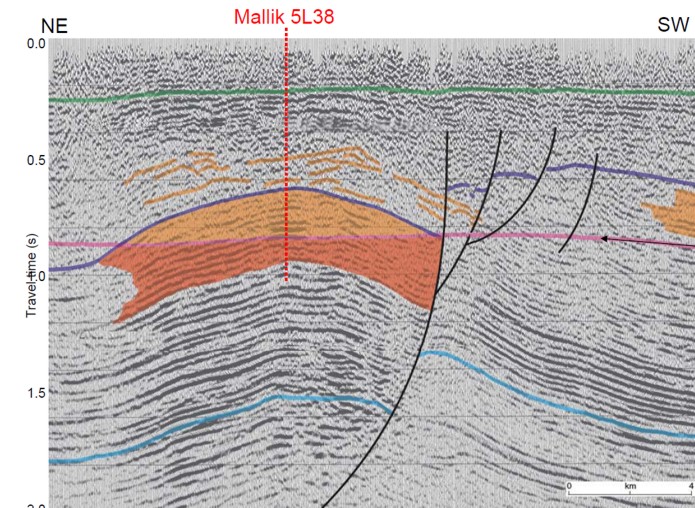 Seismic section on Mallik structure, shaded area shows gas hydrate