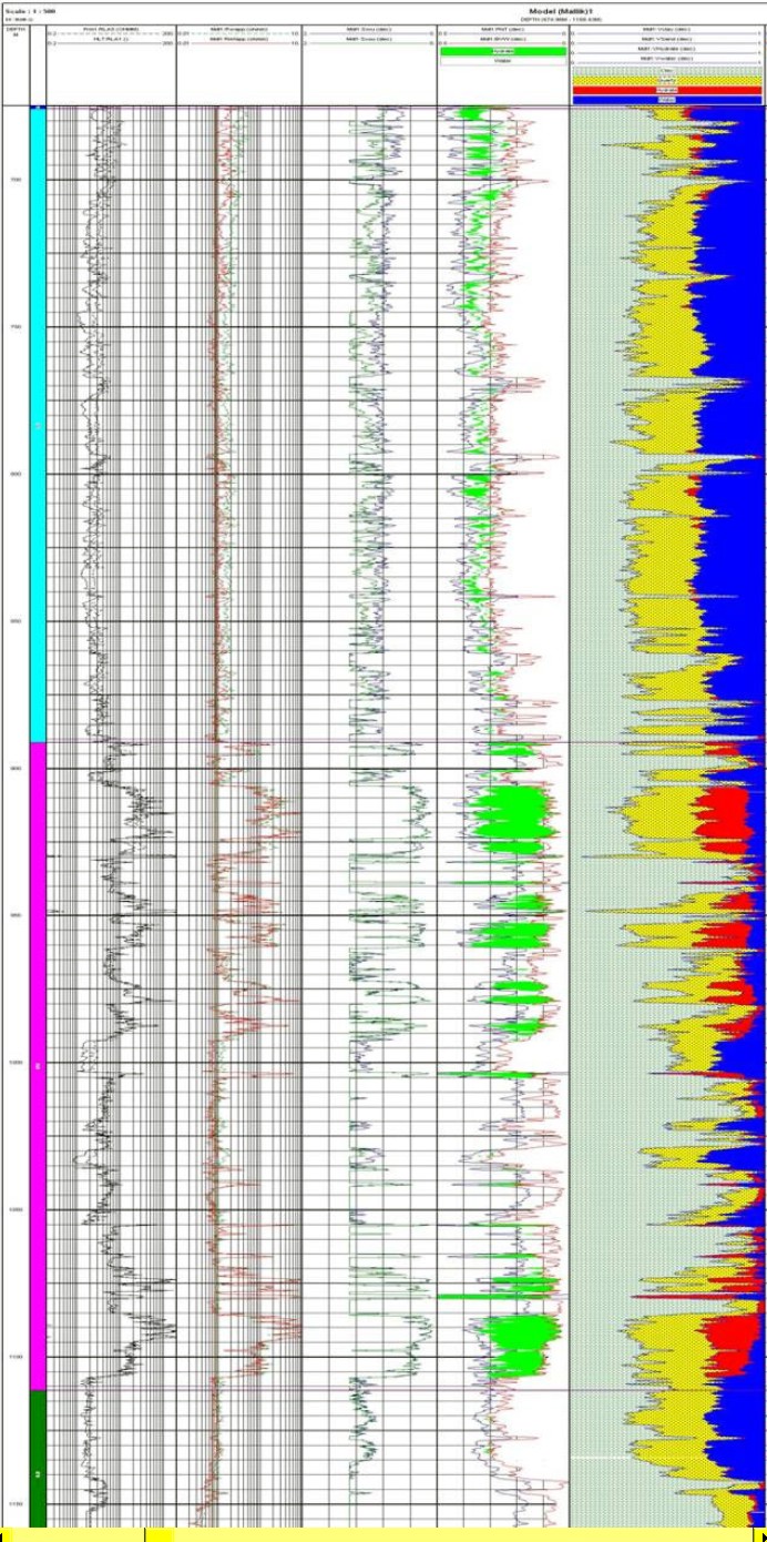 (yellow), hydrate (red) and water (blue). Note depths are in meters