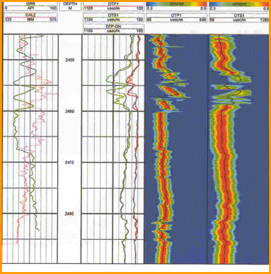 The 3 tracks on the left show the measured gamma ray, caliper,