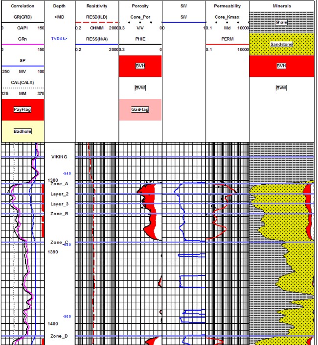 Bakken “Tight Oil” example showing core porosity (black dots), core oil saturation (red dots).