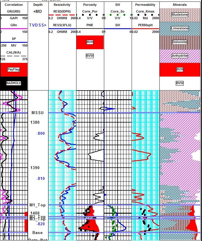This example shows a comparison of residual oil from core in a depleted zone (M1 interval) and in a bypassed zone (M3 interval). The Sor from core equals (1 - SW) from log analysis, so there is no moveable oil in the M1. The close match suggests that most of the saturation parameters (A, M, N, RW@FT) and porosity are reasonably well calibrated. Since the world abounds with depleted zones (most are well known to the well operators) this test should always be made to confirm SW parameters where ever core data is available.