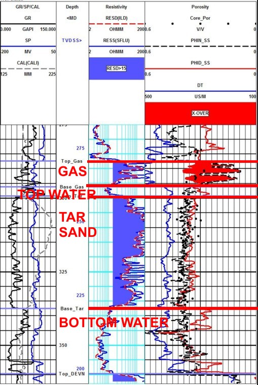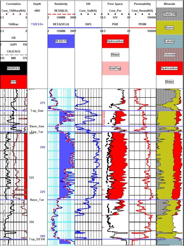 Bitumen sand example using Vsh calculated from minimum of Vshr and