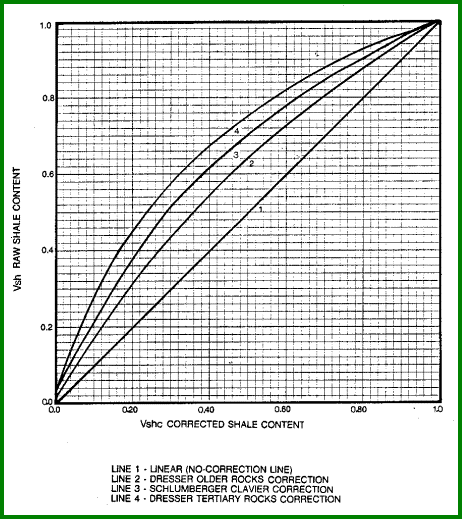 Various studies have shown that the GR, and in some cases the SP, is not a linear prediction of shale volume. Various formulae are used to modify the linearly derived shale volume to obtain a more satisfying answer.