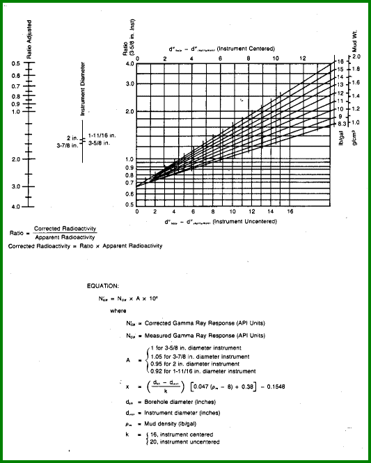 The fixed constants in these formulae may need to be varied for some logging tools. A chart indicating corrections for more complex situations and the associated mathematical formulae are shown below, courtesy of Dresser Atlas. If mud properties are unknown, the usual solution is to do nothing and use the GR value as is.