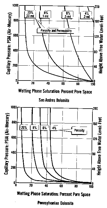 The water saturation for a given core plug is taken from the graph (or associated data listing) at the height above free water that is appropriate for the well in question. Notice that each cap pressure curve has an associated porosity and permeability value. Low permeability and low porosity rocks have high natural water saturation.