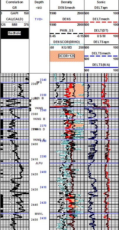 a petrophysical analysis, or the elastic properties of the rocks. Rough borehole conditions and gas effect are the most common problems that will need to be repaired. Exactly what you do to reconstruct the log data will depend on what you want to do with that data. For example, in a conventional quantitative petrophysical analysis, we go to great lengths to avoid using bad data to obtain our results. Gas effect in the invaded zone is handled by well established mathematical techniques or by calibration of results to core analysis data if the logs are inadequate for the purpose. For stimulation design modeling, you want the logs to accurately represent a water-filled reservoir. Since logs read the invaded zone, light hydrocarbons (light oil or gas) make the density log read too low and the sonic log read too high, compared to the water filled case. The magnitude of the error cannot be estimated without reconstructing the logs from an accurate petrophysical analysis. The light hydrocarbon effect problem alone would lead to erroneous elastic properties and erroneous Poisson' Ratio, Young's Modulus, and closure stress predictions. Add some rough borehole effects, and you have a meaningless set of elastic properties for stimulation modeling. Don't despair, there is a solution. Geophysicists modeling seismic response also need good log data for creating synthetic seismograms, calibrating seismic inversion models, and for direct hydrocarbon detection models. The problem here is quite different than either the petrophysical analysis or stimulation design cases. If light hydrocarbon effect exists in the invaded zone, this must be removed and then replaced by a set of log values representing the un-invaded reservoir condition. This is the opposite of the stimulation design problem. In seismic modeling in light hydrocarbons, the density does not read low enough and the sonic does not read high enough to represent the undisturbed reservoir. Unless we fix this, reflection coefficients are too small, inversion models of Poisson's Ratio will not be calibrated, and direct hydrocarbon interpretations will be misleading. We call this process log editing, or log repair, or log reconstruction, or log modeling . We can also create missing log curves by the same reconstruction methods. Some calibration data is required from offset wells to do this reliably. The reconstructed logs are often called synthetic logs, to distinguish them from the original measured data set.