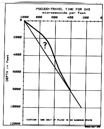The hydrocarbon "pseudo-travel-time" is derived empirically by comparing results from synthetic seismograms and properly processed field data. A very rough approximation of hydrocarbon "pseudo-travel-time" with depth, which has given reasonable results in the western Canadian rock sequences, is shown at left. Travel time for liquids, such as oil and salt water (formation water) are more predictable and may be used in the Wyllie equation without reservation.