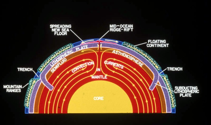 Illustration of convection currents that move tectonic plates, creating rifting, mid-oceanic ridges, and