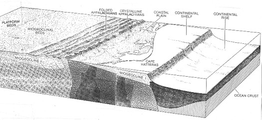 Landward of the rise and capping the continental shelf is a wedge of sediments that becomes progressively thicker as it extends towards the shelf edge. This wedge is the miogeocline and is really a very young geosyncline, before it is fully formed. The sediments are soft and relatively un-compacted.