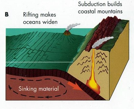 One edge of a plate is a subduction zone, usually marked by a trench where the plate dives deeply into the earth's mantle, underneath another plate. On the opposite side of the plate is a mid-ocean ridge or pull-apart zone. As the rift opens, the gap is quickly healed from below by the inflow of molten rock. The other two sides of the plates connecting the rifts to the trenches are shear zones, called transform faults.