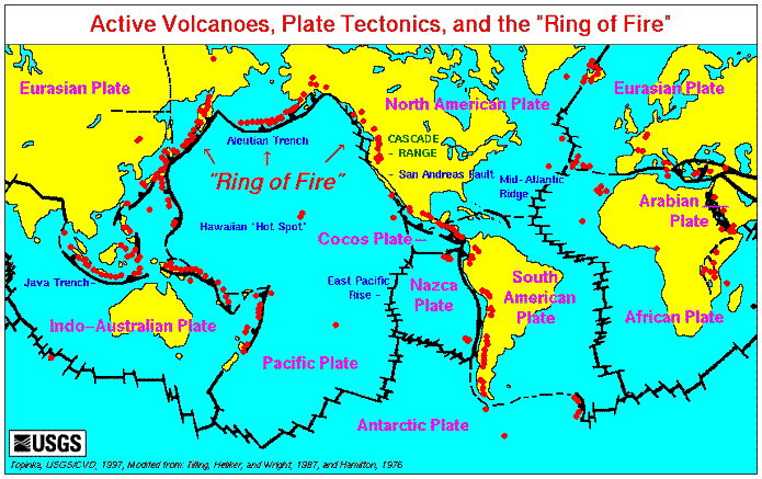 Major continental plates, mid-oceanic ridges, transform faults, and subduction zones today, active volcanoes shown in red.