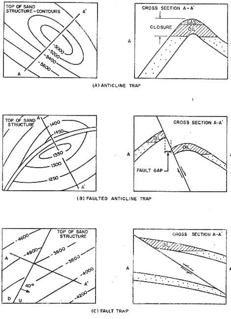 The trapping mechanism is one of the most important aspects of petroleum geology. For example, if porous rock has been folded upward into a dome or anticline, oil and gas may collect at the top of such a structure. It may be kept from escaping by an overlying nonporous layer of rock. Traps can also be formed by faults, which allow a porous layer to be thrust against a nonporous layer, thereby sealing in the hydrocarbon. Examples are shown below.