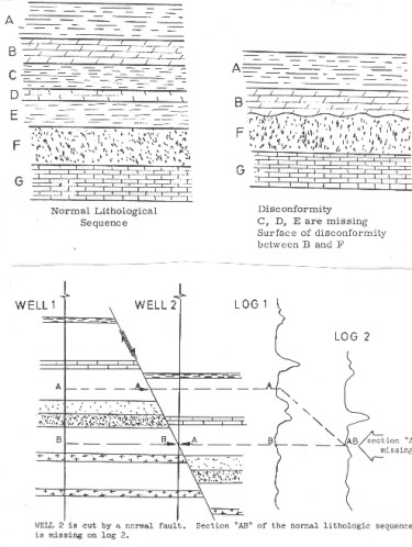 Fault planes formed by gravity or tension usually dip at 45-60 degrees. Invariably, wells that pass through a normal fault drill an abnormally short section of sediments. The thickness of the missing section is equal to the throw of the fault. This is a good criterion for locating the fault if there is enough well control. In the absence of sufficient data, it is easy to mistake the missing section caused by faulting for an erosional surface, which also creates a missing section.