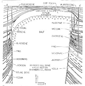 Complex faults are typical of salt domes. A salt dome field may produce from 10 or 20 separate reservoirs, or even more because of the faulting and geometry of the flanking sandstone layers. A simple example is given at the right.