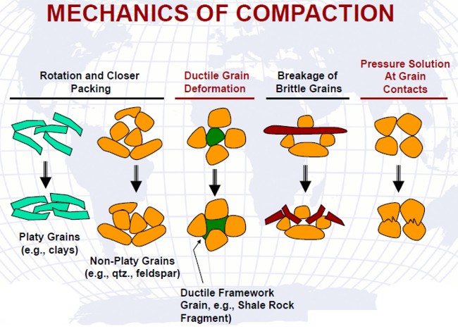 Normal sedimentary processes of compaction compress the rocks, reducing porosity and sometimes changing the shape and size of rock grains, as shown in the illustration above. The pressure difference between overburden and internal pore pressure is referred to as the effective overburden pressure. During pressure depletion (oil or gas production) operations, the internal pore pressure decreases and, therefore, the effective overburden pressure increases. This increase causes the bulk volume of the reservoir rock to reduce, and the rock grains to expand, reducing porosity.