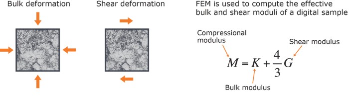 The application of stresses to the faces of the sample generates strains in the rock frame that are computed locally using the finite element method (FEM). The resulting effective deformations of the sample are related to the stresses applied at the boundaries to calculate the effective elastic moduli. This application assumes linear elasticity laws are valid within the sample. Therefore, the elastic moduli can be converted into the elastic-wave velocities.