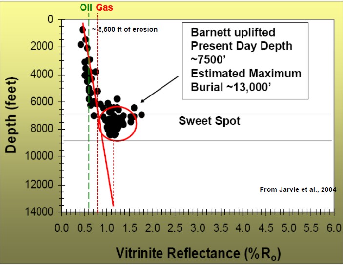 vitrinite reflectance (Ro) versus depth for a Barnett shale, showing