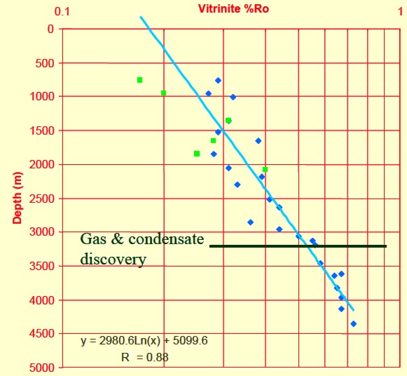 represent oil prone intervals. Ro > 0.78 usually indicates gas