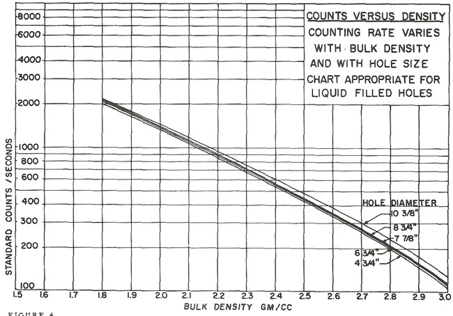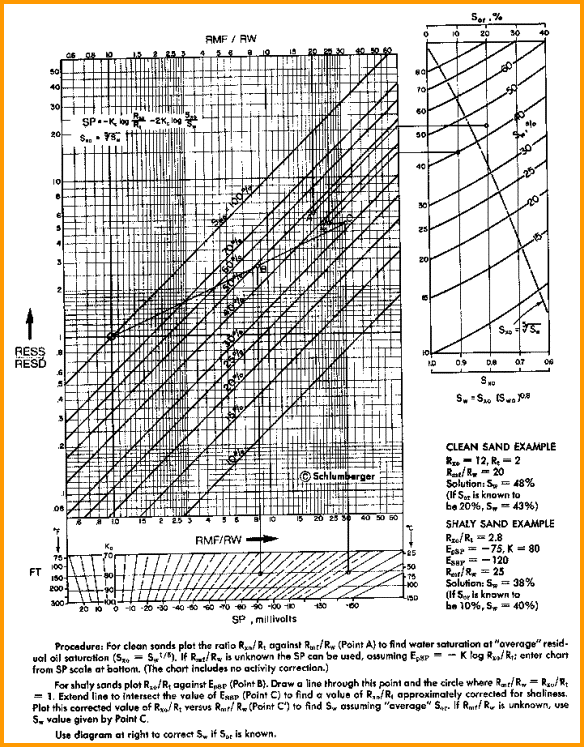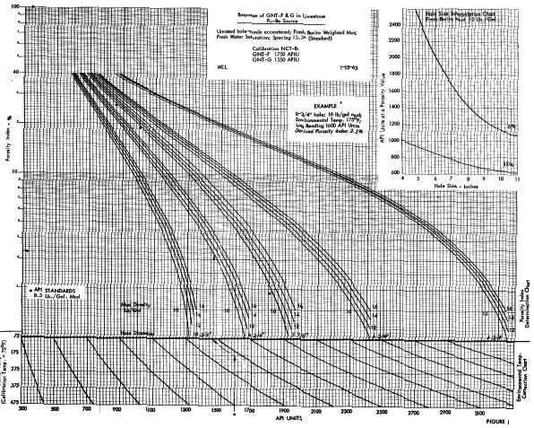 A large number of charts for specific tools, spacings, borehole conditions and rock types were available from service companies, such as the one shown below. These may no longer be easily found today, and the semi-logarithmic approach described below works well except in very low porosity .