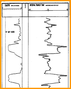 Changes in borehole size also cause spikes on the log, to both the high and low travel time directions. These are not cycle skips, but are due to the unequal travel time to each detector through the mud in the brehole.