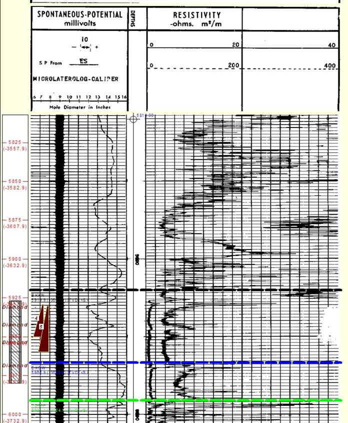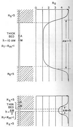 The lateral curve on an ES log is not symmetrical and leaves a blind spot at the top or bottom of a resistive bed (pay zones). The normal practice in most parts of the world is to run the electrode arrangement, called the inverse lateral, that puts the blind spot on the bottom of the reservoir. The blind spot is the thickness of the tool spacing, 18'8" for typical tools. The blind spot shows low resistivity when it ought to show high resistivity, so the bottom 19 feet of the pay zone looks wet. If the other electrode arrangement is used, the top 19 feet look wet, as illustrated at right.