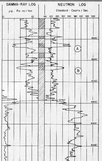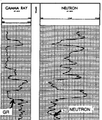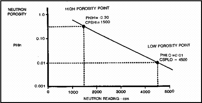 There were three source types used (RaBe, PuBe, and AmBe) and several source - detector spacings (15.5 and 18.5 inches were common), combined with hole size, mud weight, and casing variations, leading to a plethora of transforms. Some service companies didn't have a lot of faith in their charts - one used the term "Strata Index" instead of "Porosity" on the Y-axis. If no appropriate chart exists, or if you don't believe in them, it is expedient to use the "High porosity- Low porosity" method. 1. Select a high porosity point on the log, usually a shale, and assign it a porosity based on offset wells with scaled logs or a local compaction curve. This is PHIHI. 2. Pick the count rate on the neutron log at this point - this is CPSHI, even though it is a low numerical value. 3. Choose a low porosity point on the log. Assign this a porosity value, again based on offset scaled porosity logs or core porosity. This is PHILO. Tight lime stringers or anhydrite are best but you need some imagination if there are no truly low porosity streaks. 4. Pick the corresponding count rate on the log. This CPSLO, even though it is a larger number than CPSHI. 5. Plot these points on semi-log graph paper as shown below. Read porosity for any other count rate from the graph.