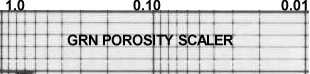 Logarithmic scaler for reading porosity from an un-scaled neutron log. Draw vertical line on log at low porosity point (say porosity = 0.05) and another line at high porosity point (usually a shale - say porosity is 0.30). Align scaler between the two lines, setting 0.05 on scaler at low porosity line, and 0.30 on scaler on high porosity line. Skew scaler to obtain good fit. Mark other porosity points on log. Enlarge or reduce scaler in copier to fit smaller or larger logs. High and low porosity points are a matter of good judgment tempered by core or log analysis results from modern wells.