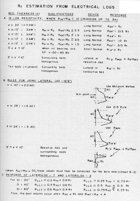 There are special rules for picking the formation resistivity from the long normal (RESD in this book, Rt in most of the literature). These are empirical rules that work reasonably well and circumvent the need for bed thickness and borehole corrections. The rules are shown in the top half of of the illustration below..