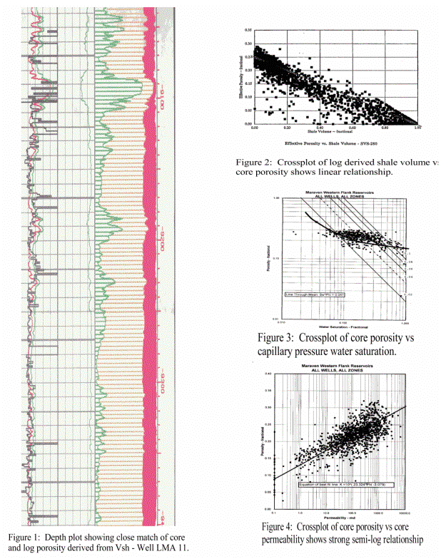 During a project to analyze the log and core data on 150 wells in the Western Flank Reservoirs offshore in Lake Maracaibo, we developed a technique to determine accurate values of porosity, water saturation, and permeability from old ES logs. The depositional environment is a complicated sequence of superimposed fluvial channels, resulting in many isolated channels that were not fully drained by nearby wells. It was therefore necessary to obtain a quantitative reservoir description for all wells in the project area, even if the log suite did not lend itself to direct calculation with traditional log analysis methods. These highly detailed reservoir properties from log analysis were augmented by similarly detailed seismic and stratigraphic correlations, and integrated together in a reservoir simulator to provide an accurate historical and predictive model for production optimization. We would not have been able to do this to a useable level if only the wells with full porosity log suites were used. The method used requires calibration to conventional and special core data and/or modern porosity log suites. Conventional core analysis data, electrical properties, and capillary pressure data was provided in paper form. This data was entered into a spreadsheet database for processing and was placed in each well file for depth plotting with the log data. Core data was depth shifted to match well log depths. Our objective was to define a method that would utilize all available log and core data while providing the most consistent results between old and new well log suites. A detailed foot-by-foot analysis was required to allow summations of reservoir properties over each of many stratigraphic horizons. Shale volume (Vsh) was calculated from the gamma ray (GR), spontaneous potential (SP), and deep resistivity (RESD) responses. The minimum of these three values at each level was selected as the final value for shale volume. A unique clean sand and pure shale value for GR, SP, and RESD were chosen for each zone in each well. A linear relationship was applied to the Vsh from GR. The resistivity equation for Vsh is similar to the GR equation, but uses the logarithm of resistivity in each variable. Where a full suite of porosity logs was available, effective porosity (PHIe) was based on a shale corrected complex lithology model using PEF, density, and neutron data. The method is quite reliable in a wide variety of rock types. No matrix parameters are needed by this model unless light hydrocarbons are present. Shale corrected density and neutron data are used as input to the model. Results depend on shale volume and the density and neutron shale properties selected for the calculation. Therefore, the porosity from this stage is compared to core porosity where possible, and parameters are revised until a satisfactory match is obtained. In wells with an incomplete suite of porosity logs, we used a model based on the shale corrected density log, shale corrected neutron log, or the shale corrected sonic log. Again, a comparison with core or nearby offset wells with a full log suite is necessary to confirm shale and matrix parameters. In wells without any porosity logs, porosity was based on the shale corrected total porosity model, where total porosity (PHIMAX) was derived from offset wells with porosity logs or from nearby core analysis. The equation used was PHIe = PHIMAX * (1 - Vsh). This step was the most important contribution to the project as it integrates all available data in all wells in a consistent manner. The value for PHIMAX was derived from a map of the average of the total porosity of very clean sands in modern or cored wells. The map was inspected and a transform created which varied the PHIMAX value from south to north through the project area. The effectiveness of this method is demonstrated by the close match between core and log analysis porosity in well LMA 11, shown in Figure 1. Another way to see this relationship is in a crossplot of log derived shale volume versus core porosity as in Figure 2. In modern wells, PHIMAX is also used to limit the porosity results. This limit is needed because rough hole conditions or sonic cycle skips can cause erroneous porosity values to be computed. PHIMAX is computed as above, but modified by adding 0.03 to the result. This higher value for PHIMAX prevents the reduction of those few legitimate porosity results which are slightly higher than usual on the logs. From this stage onward, both old and new wells were treated identically, with water saturation, permeability, and mappable reservoir properties being derived in a uniform and consistent manner. Water resistivity (RW) was varied with depth to account for the temperature gradient over the computed interval. These values were confirmed by the obvious water zones in the lower sands in a number of wells. Care must be taken to segregate swept zones from original water zones when checking the RW value. Swept zones show residual oil on log analysis of between 20 and 60 percent. Back calculation of RW in a swept zone will lead too high a value for RW. Water saturation (Sw) was computed with a shale correction using the Simandoux equation and with the Waxman-Smits equation. Both equations reduce to the Archie equation when shale volume is zero. Simandoux and Waxman-Smits methods gave very similar results in this project area. The resistivity curves used were the long normal from ES logs, the deep induction, or the deep laterolog. The shale resistivity (RSH) needed for these equations was chosen by observation of the logs and crossplots. RSH was varied from well to well to account for differences in response between electrical logs, induction logs, and laterologs in shale. Resistivity anisotropy and hole size or mud resistivity effects cause these differences. The range of values used is small, between 4.0 and 5.0 ohm-m. Values of A, M, and N of 1.00, 1.80, and 2.00 were input, based on special core a