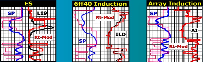(SN) and mud resistivity (RM), of the form: This method was developed by Dr Ovidio Suarez and is documented in internal reports provided by the client. The parameters A through D were derived from correlations with hydrocarbon pore volume (HPV) estimated from core analysis. The method does not account for borehole effects, invasion, or variations in grain size, sorting, or shaliness, all of which influence HPV from this type of correlation. It also does not generate a porosity value, so results cannot be compared easily to core data and cannot be used to calculate permeability. Large differences in results between adjacent wells were noted, leading to the conclusion that these inconsistencies should be addressed in our new work. In the porosity track of Figure 37.17 (above), the green line is porosity from SOPHI based on the SWe derived in our study: PHIrt = SOPHI / (1- SWe). This well shows a good agreement between the two methods but others do not, because the short normal is not always a good indicator for RT. It should be noted, however, that at the time the method was invented, it was the best approach available for un-cored intervals, since modern porosity indicating logs had not yet appeared on the scene. The