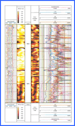 Comparison of array induction log (left) and azimuthal resistivity laterolog (right). Curve complement and presentations vary considerable with age and contractor. The image log on the azimuthal resistivity presentation is "poor man's" resistivity microscanner log, giving a reasonable sand count  regional dip, and some fracture information. A real microscanner image is shown for comparison (left image).