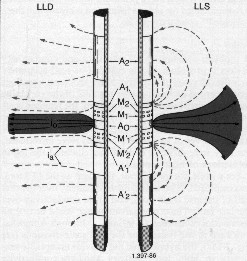 The laterolog is a direct current (DC) tool based on Ohm's Law. The tools have been designed to produce reliable resistivity measurements in boreholes containing highly saline drilling fluids and/or when surrounded by highly resistive rocks. The logging current is prevented from flowing up and down within the drilling fluid by placing focusing electrodes (A1 and A2) on both sides of a central measure electrode A0, as illustrated below. The focusing electrodes force measure current to flow only in the lateral direction, perpendicular to the axis of the logging device.