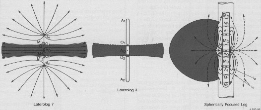 Schematic diagrams of laterolog 7 (left), laterolog 3 or Guard log (middle) and spherically focused log (right). Grey shading represents desired current path. The Laterolog 7 electrode arrangements can be likened to two ES logs spliced together, with one tool upside down. The center current electrode A0 is in the middle of the current path. Guard electrodes A1 and A2 keep the current focused. On the LL7, measure electrode pairs M1 and M2 straddle the top and bottom current path boundary. The secret is to keep the current flow constant to get an accurate resistivity.