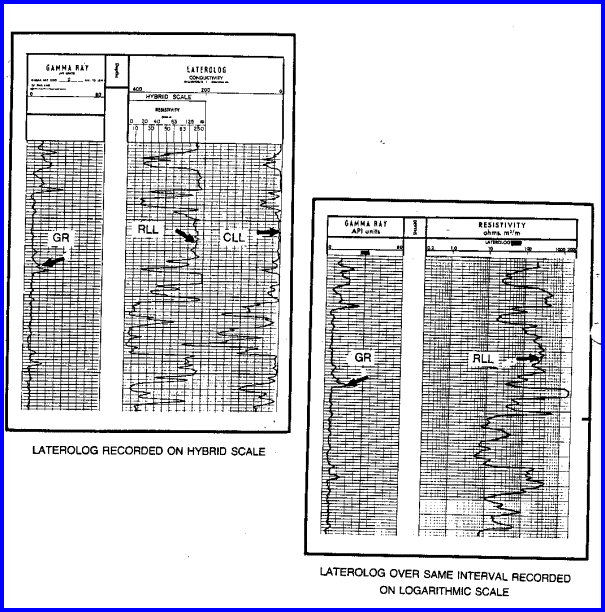 Sample Laterologs, with gamma ray, showing hybrid resistivity scale (left) and logarithmic scale (right) over same wellbore interval. Many varieties of Laterolog are run today, some with a dozen or more resistivity curves.