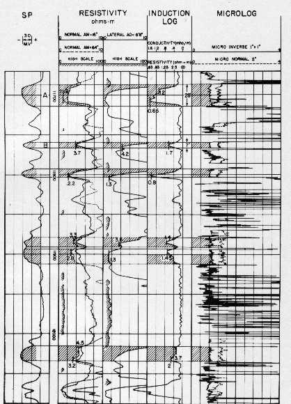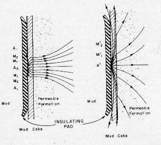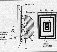 A voltage of constant intensity is applied to the center electrode while a controlled supply of current is applied to the focusing electrodes. The potential difference between the center electrode and the focusing or guard electrodes is maintained at zero by automatic controls. This has the effect of focusing the current into a narrow beam perpendicular to the pad and into the formation. The current beam maintains a uniform shape through the mud cake, spreading out as distance from the pad increases. The potential difference between the center electrode and the remote electrode, in combination with a calibration constant, is a measure of the apparent resistivity of a small volume of the formation near the borehole. The depth of investigation is about three inches from the tool pad. For mud cake less than 3/8 inch thick, the effect of mud cake on tool response is small and can generally be ignored. With flushed zone thickness of two to three inches. The tool reads flushed zone resistivity (Rxo) directly. In wells drilled with low resistivity