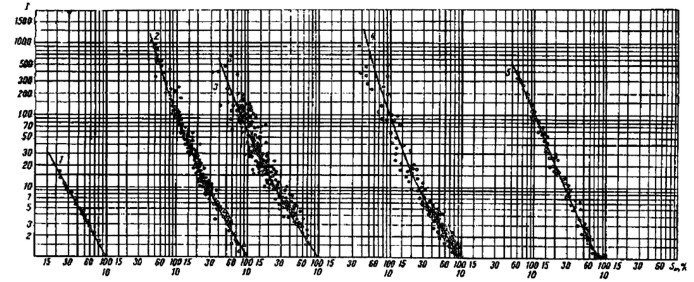 Water saturation vs resistivity index for five different Russian oil fields, see Wiltgen paper for details.