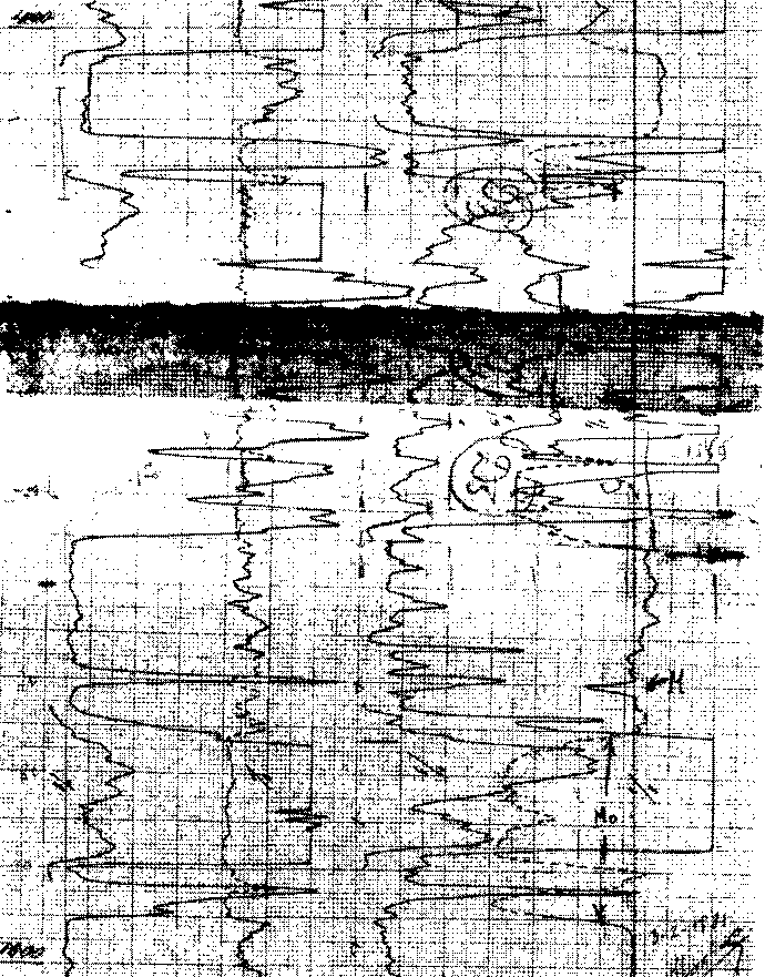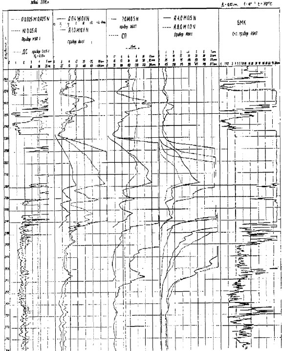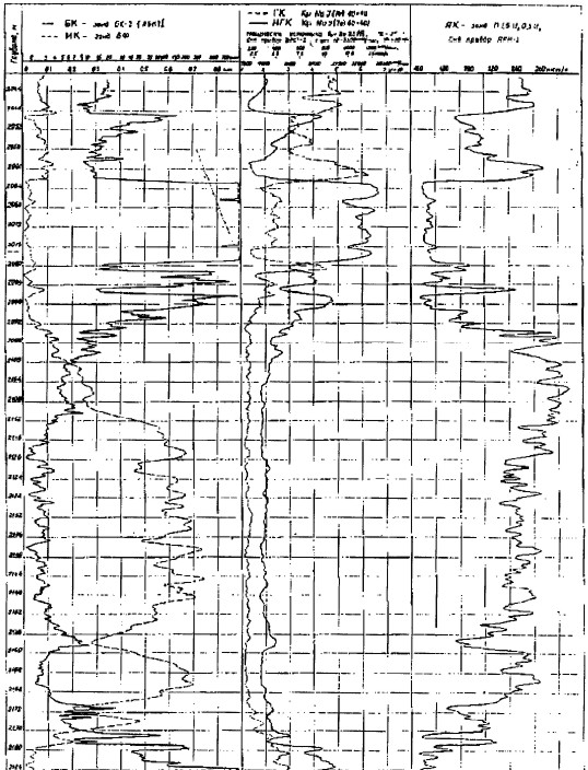 The tool that ran the lateral curve is called a BKZ logging tool. A Spontaneous Potential (PC) curve was recorded with each log run. Only one resistivity curve plus the SP could be recorded on one pass into the well bore, so multiple passes were made to get alternate spacings or electrode configurations. In the early days, this meant that the crew carried a host of different logging tools to the wellsite. Later, a multi-electrode tool was built; jumper wires at the top of the tool allowed the operator to change the electrode configuration without changing tools. The original log with one resistivity curve and the SP was recorded on paper with a stylus or pen recorder, and later on photosensitive paper with a galvanometer. A primitive gamma ray log (GK) and neutron log (NGK), similar to Schlumberger's GNAM and GNT tools, were in evidence by the early 1950's. In the West, two Normals, a Lateral, and an SP could be run simultaneously, using an ingenious electrode switching device called a pulsator. It was a highly sophisticated motorized rotary switch, but very simple in concept; it is surprising that the Russians never duplicate this method of multiplexing several measurements from a single tool.