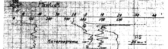 The spacing of the lateral and normal curves is noted at the top of the log near the scale (both handwritten), as for example B2.5A0.5M or M0.75A3B. The letters represent the standard Schlumberger electrode nomenclature and the numbers represents the electrode spacing in meters. For a Normal curve AM is always less than AB. The same electrode arrangement with different spacing can make a lateral curve, for example B0.25A2M, where AM is greater than AB.