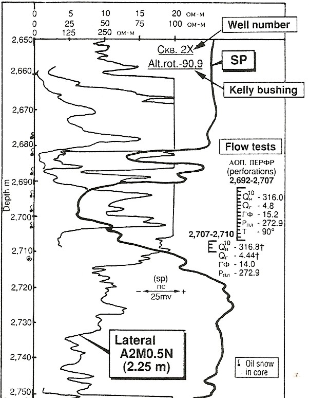 Most FSU wells were drilled with "native mud' so invasion could be quite deep, making SW calculations somewhat erratic. The use of multiple spacing lateral curves was intended to overcome this. The following two illustrations show the changes in resistivity as the tool spacing or tool type is changed. Both images are from "THE ESSENTIALS OF BASIC RUSSIAN WELL LOGS AND ANALYSIS TECHNIQUES" by N. A. Wiltgen, SPWLA 1994.