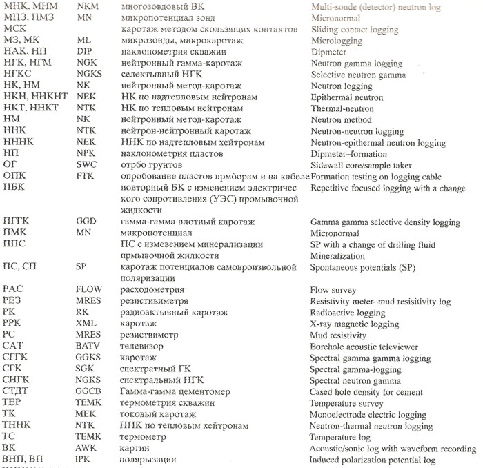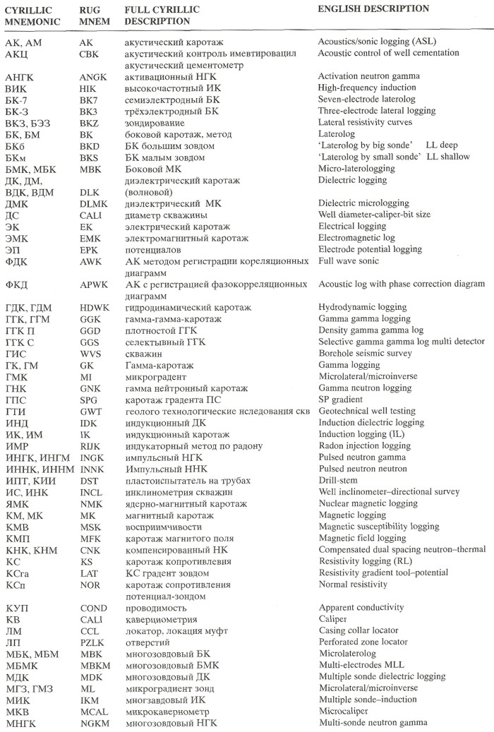 LIST OF TYPICAL RUSSIAN LOGGING TOOL NAMES