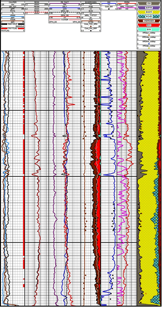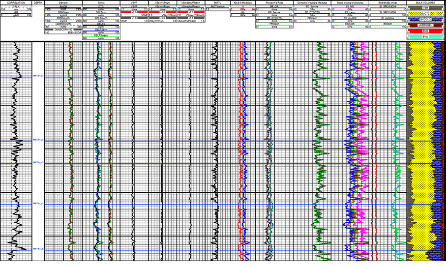 Sample of a mechanical properties log analysis. Left hand tracks show original and reconstructed logs. All results are shown in that right hand tracks. At far right is the lithology / porosity track for correlation.