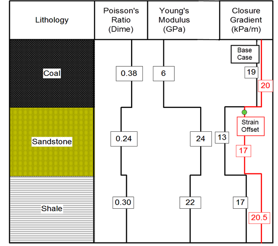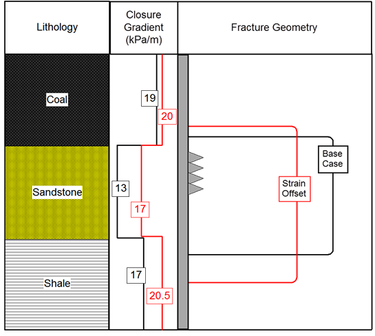 Applying a strain offset can decrease the stress difference between the reservoir and non-reservoir intervals - fracture geometry will be affected compared to base case.