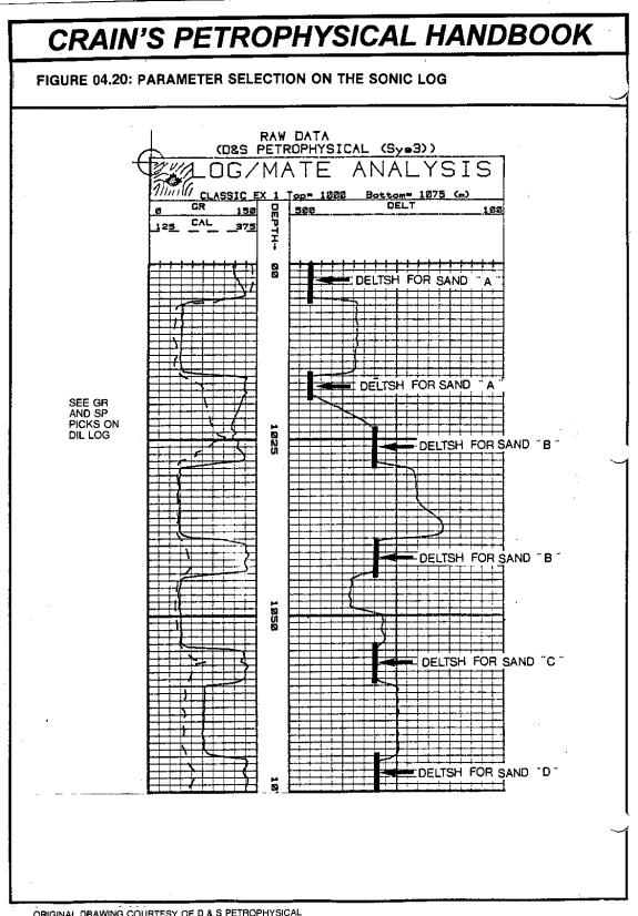 Sonic travel time in shale (DELTSH) also varies with depth.