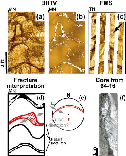(d) sketch of fractures, (e) fracture orientation, (f) core image.