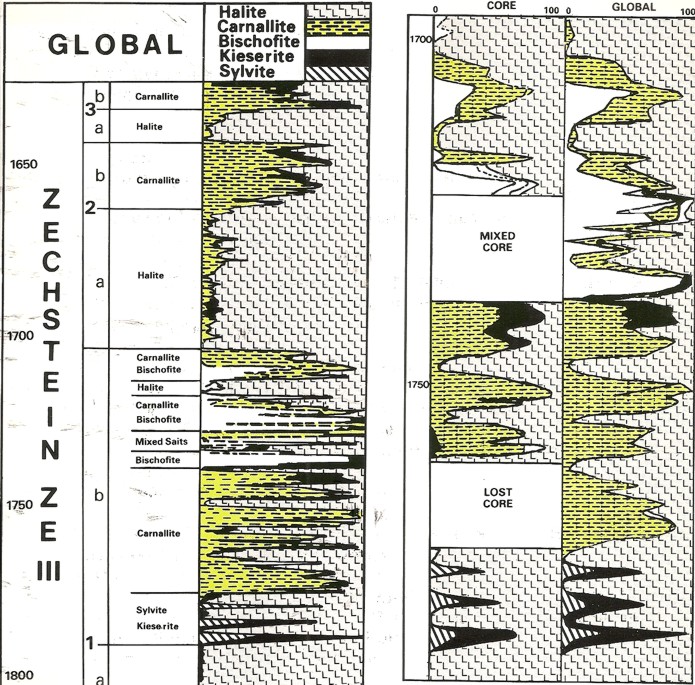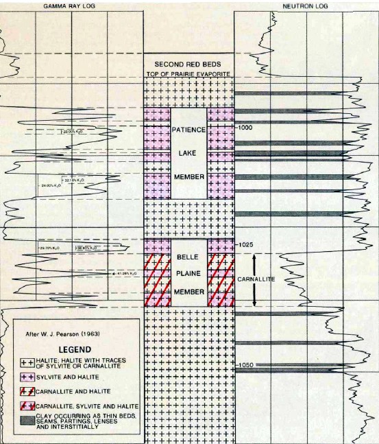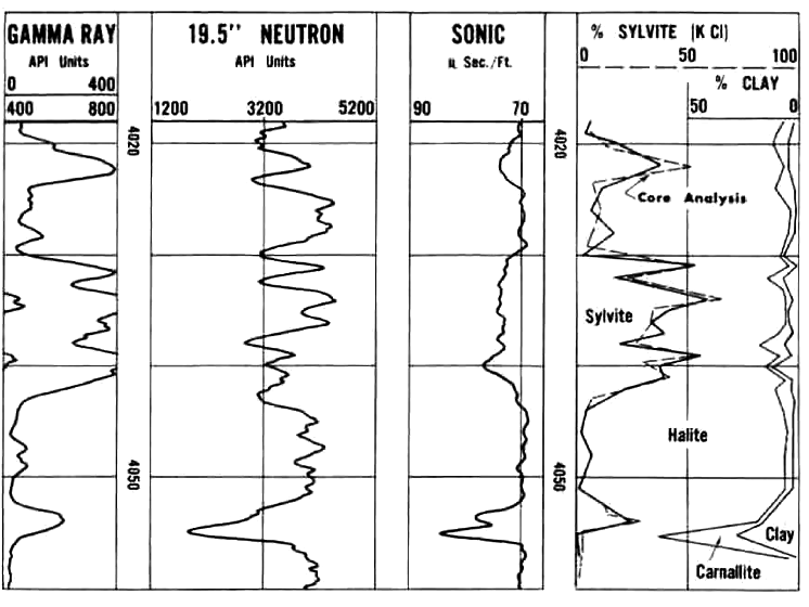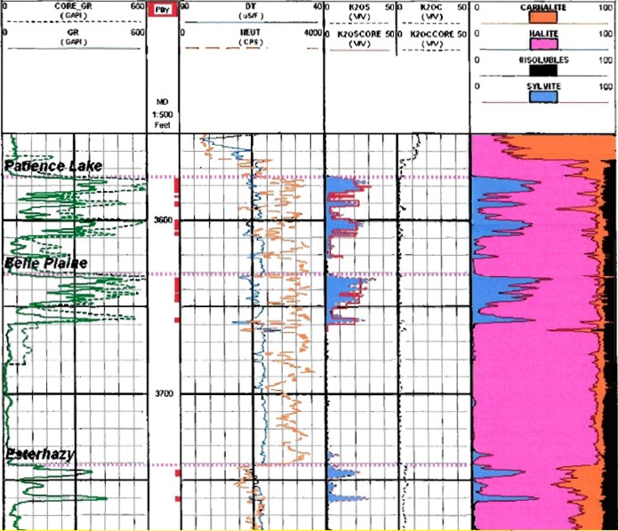 to core assay, grading to Carnallite near the base, normal log presentations.