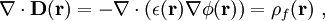 which is Poisson's equation in the case where ε is independent of position (that is, when the material is homogeneous). The formulation of Table 1 is assumed. That is, the bound charge is subsumed under the permittivity, and only the free charge is explicit on the right side of the equation.