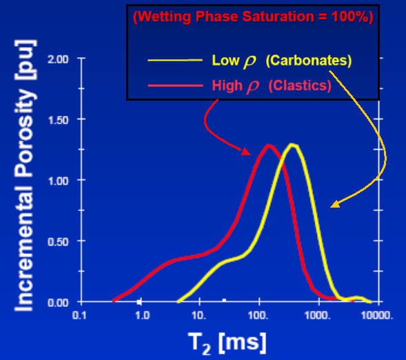 T2 distribution for heavy oil (red curve) and light oil (yellow) -