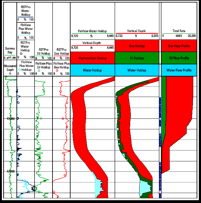 Layered flow often occurs in high angle wells, with a water layer in the lower part of the wellbore cross-section, an oil layer above the water, and a gas layer at the upper part of the cross-section. One objective of the integrated tools is to create an image of the actual flow regime.