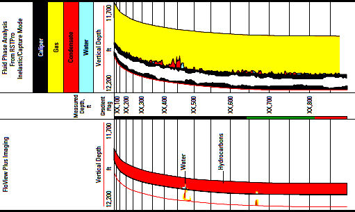 The water holdup plots of the TPHL log and FloView Plus tool's data agree well over most of the interval. Above XX,500 feet, however, the FloView Plus tool is unable to measure the small water flow values because of high water velocity and low holdup. The highest point in the horizontal section of the well occurs at approximately XX,560 feet. Little fluid is produced from below that point, resulting in high water holdup in the bottom of the well. From XX,560 to XX,800 feet, where the fluids are flowing downward, oil and water travel faster than gas and, consequently, have lower relative holdup rates. The insensitivity of the TPHL log's measurement to fluid velocity or droplet size makes it possible to detect condensate in mist flow or, as in this case, high-velocity water flow at low holdup. Above XX,800 feet, the well becomes more vertical, slowing the oil flow and increasing its holdup.