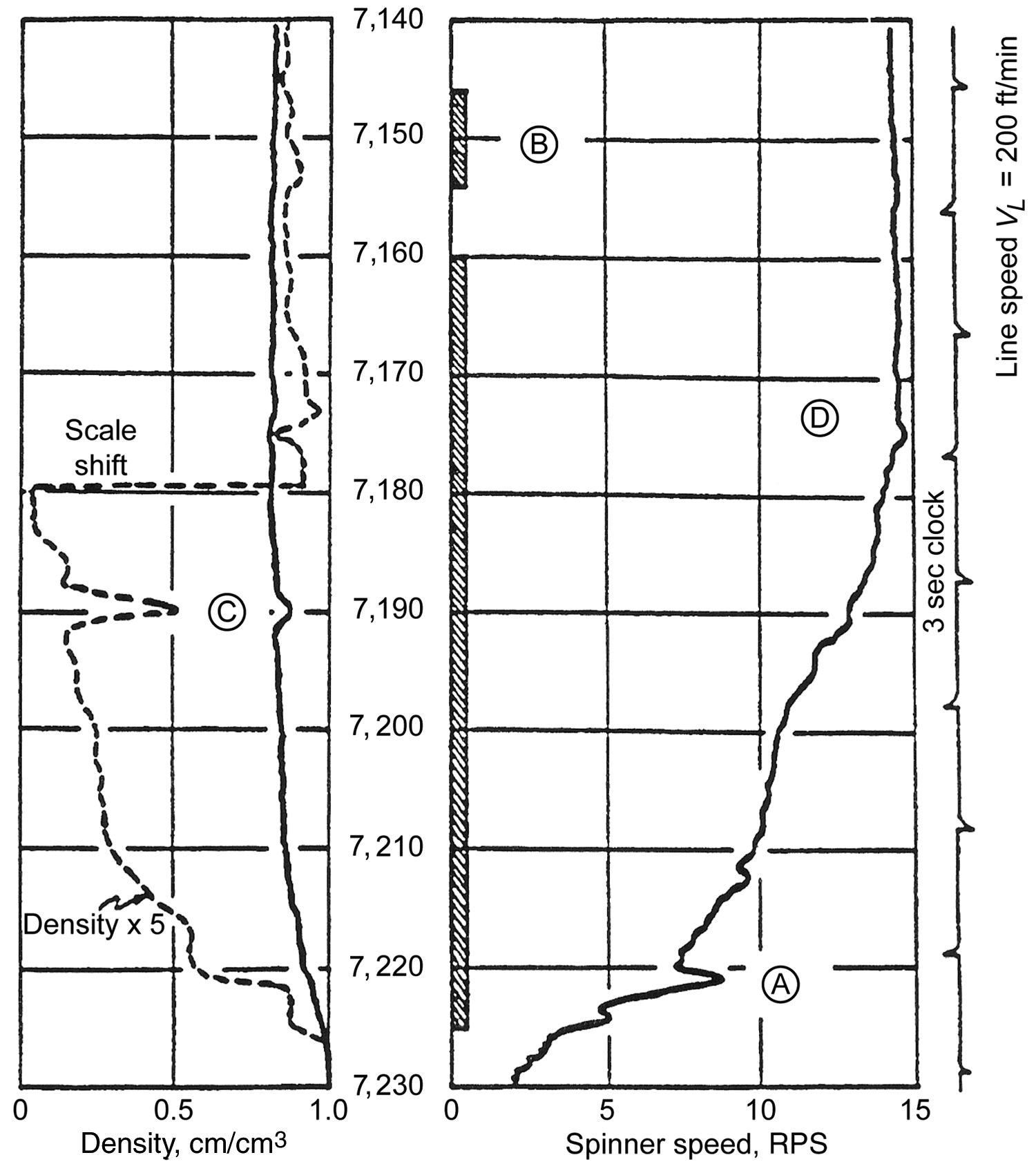 Fluid density (track 1) and spinner survey (tracks 2 and 3). Well flowing 10,000 bpd. Density shows water density in sump below perfs, oil density over perf interval. Spinner shows increasing cumulative production over lower half of perfs. The upper half of the perfs may have been ineffective or the reservoir quality is so poor that no flow can be expected. A competent forensic  petrophysical analysis could answer this question and a workover initiated if warranted. Amplified fluid density curve shows slight decrease up to 7160 feet indicating some water in the oil below this depth - this is the "water holdup".